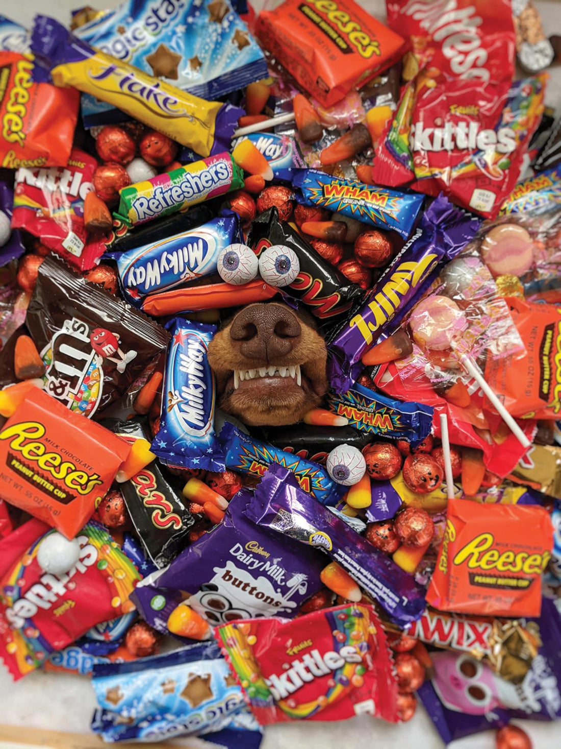 Mae The Sun yn adrodd bod Schmitt, dachshund bach, wedi'i dorri i bob golwg wedi'i gladdu mewn siocled, creision a chacennau.