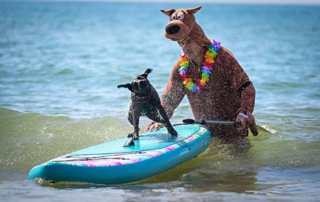 Roedd person arall i'w weld yn padlo mewn rhai Scooby Doo. Ac roedd un ci yn gwisgo asgell siarc, a oedd ynghlwm wrth ei siaced achub. Mae'r gystadleuaeth, sy'n ddigwyddiad diwrnod cyfan gyda cherddoriaeth fyw, bellach yn ei phedwaredd flwyddyn.