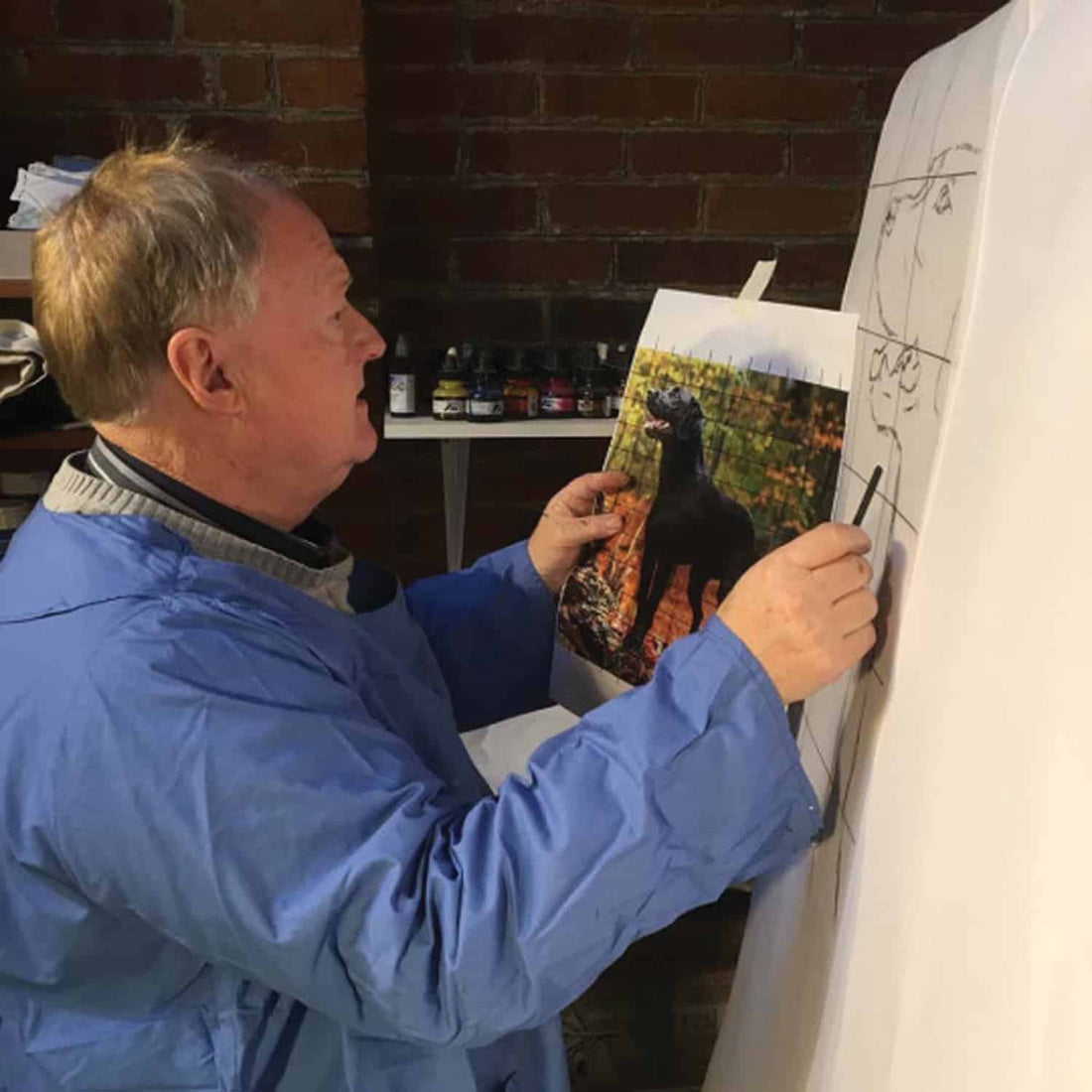 'Ar ôl gweld ci, gallaf naill ai ei baentio o'r cof neu dynnu llun i'w ddefnyddio. Rwy'n ceisio cael y llygaid yn iawn yn gyntaf, gan fod hynny'n 90 y cant ohono. 'Rwy'n eithaf cyflym yn gwneud celf, er mewn mathemateg ni allaf wneud fy nhablau amser o hyd. Gallaf wneud paentiad mewn tua 12 awr.'