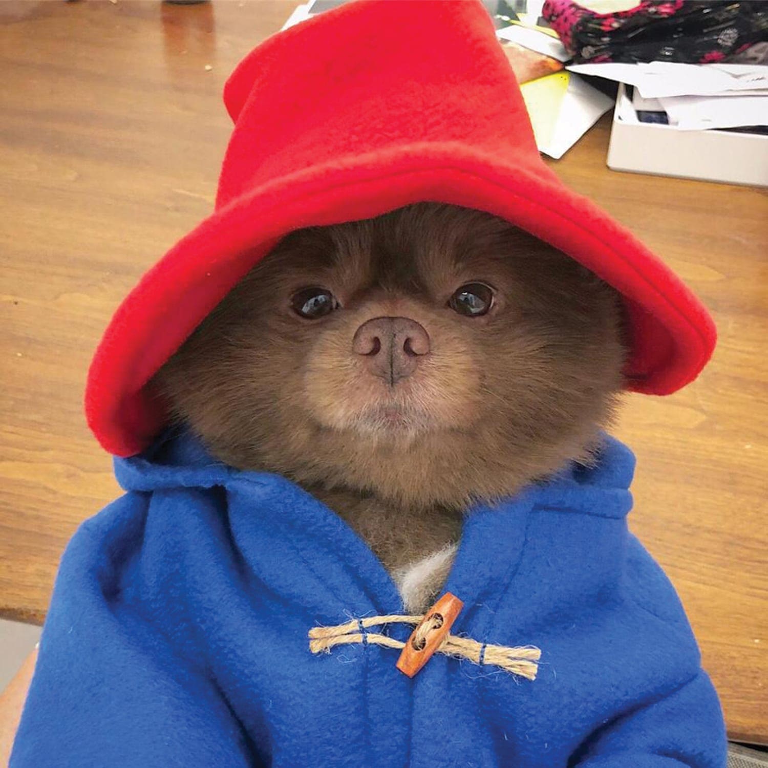 Tugann Bertram an Pomeranian tobar dearg dó nuair a ghléasann sé mar Paddington Bear.